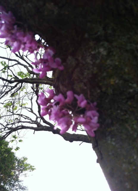 Redbud blossoms that came out on what looked like a dead trunk. They are about two months later than they should be blooming.