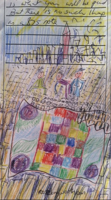 A 75 dollar note at the bottom, three people in the middle examining it and the city on top in the distance.