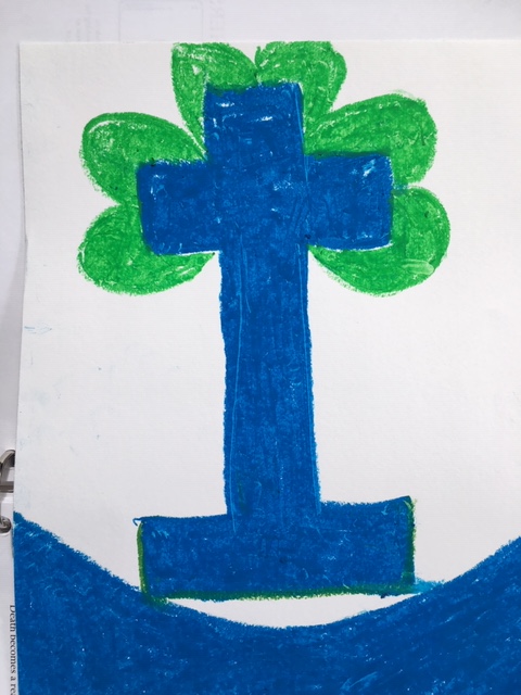 Next morning, first thing, I walked to my office where I have my oil crayons and mandala paper and proceeded to draw the blue cross. Then I wondered about the other two symbols. I decided to place the shamrock behind the cross and noticed that the shamrock makes heart shapes when put there. I made the shamrock green, for its connection to the heart chakra and its energy in us.