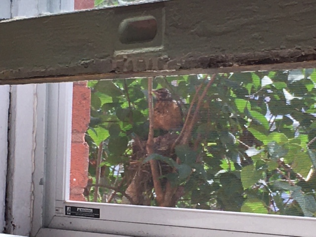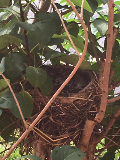 Two robins built a nest in the lilac tree just outside two of my windows. As I go upstairs to the attic I can see them head on, and from the armchair I have placed near the window in my kitchen I have a sideways view.