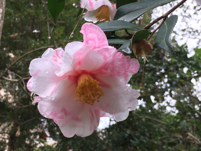 As I sat over the goldfish pond, and opened my eyes, I was looking at two trees, covered in blooms, one of red and one of pink. And flying among the blooms was a very small hummingbird, with my eyes just catching the glitter of its green and red coloring. I was very surprised as it was into the third week in December and this little bird had not gone south yet. Perhaps the many blooms were delaying the bird. Maybe it stayed to help with meditators in the garden.
