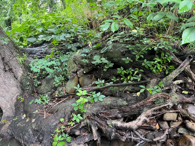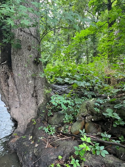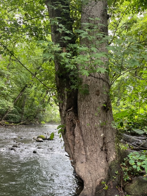 I was temped to not immerse my head but that did not last long. Soon I was on my back in the water looking up at the canopy above. Under the big maple trees, as I look into the flowing river coming toward me, the water rattles over stones before it goes deeper under the tree. Many of the roots are exposed. I decided to swim into this slightly deeper flow.