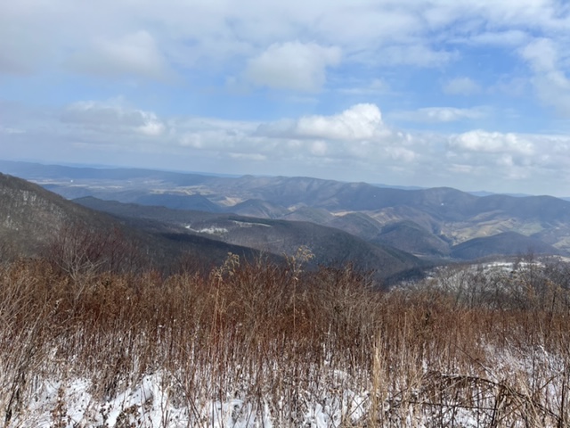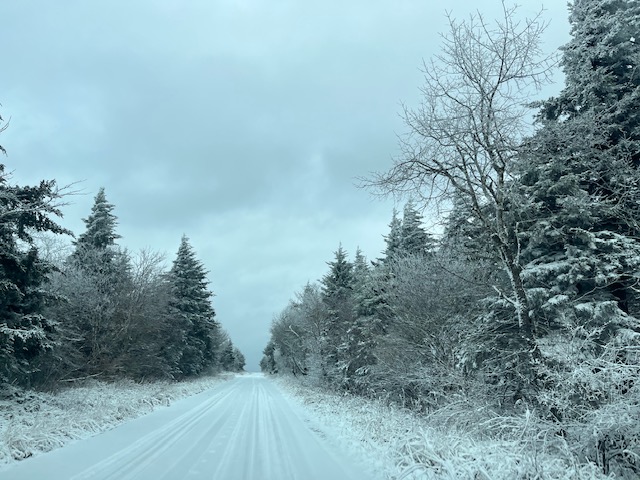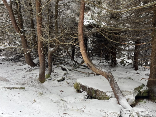 I was seized by fear and doubt as the snow got a bit thicker with less of the road visible. The driver never touched the brakes that I could detect. Then suddenly we were there at over 4,000 feet. The snow had covered the spruce trees totally with a marvelous glossy look, with a whiteness that sparkled as the sky lightened at times. There were many layers of mountains as we looked out from a two storied lookout whose sides were glassy with ice. The mountain shapes were barely visible through the misty snow.