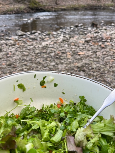Last week I went to the river twice on my bike, so I could pray by the river. I have found a log to sit on near the water, and I sit and listen to two rivers coming together. The river to my right and the river further down to my left have two distinctive sounds coming to me in stereo. It is a quiet place to meditate, back from the road and with a bank behind shielding me with privacy and silence.