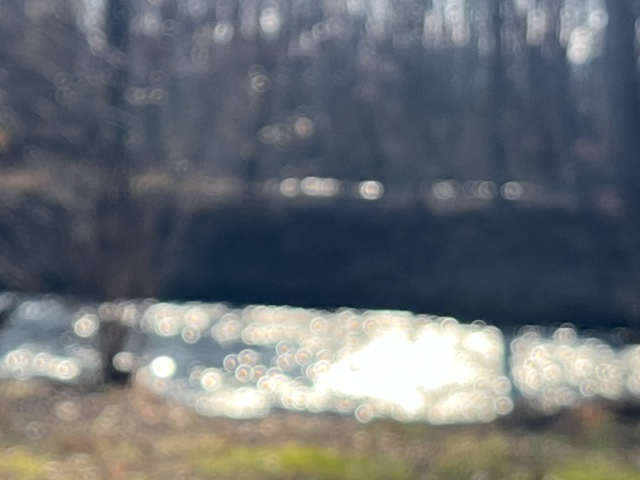 It is getting on toward evening and the sun is fast lowering in the sky through the trees. The sunlight plays on the water. I see some purple and blue mist above the water, reflected in the fine spray just over the far bank, where the sun give me the start of a rainbow. I settle to meditate and close my eyes, but not before I take some pictures and see a green streak show up in the middle of the river joining the other river. It is a luminous green.