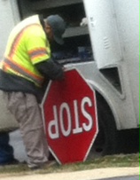 City employee fixing the stop sign on the spot